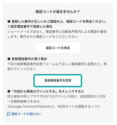 ②届かない場合、[登録電話番号を変更]を押して登録電話番号を変更できます。
