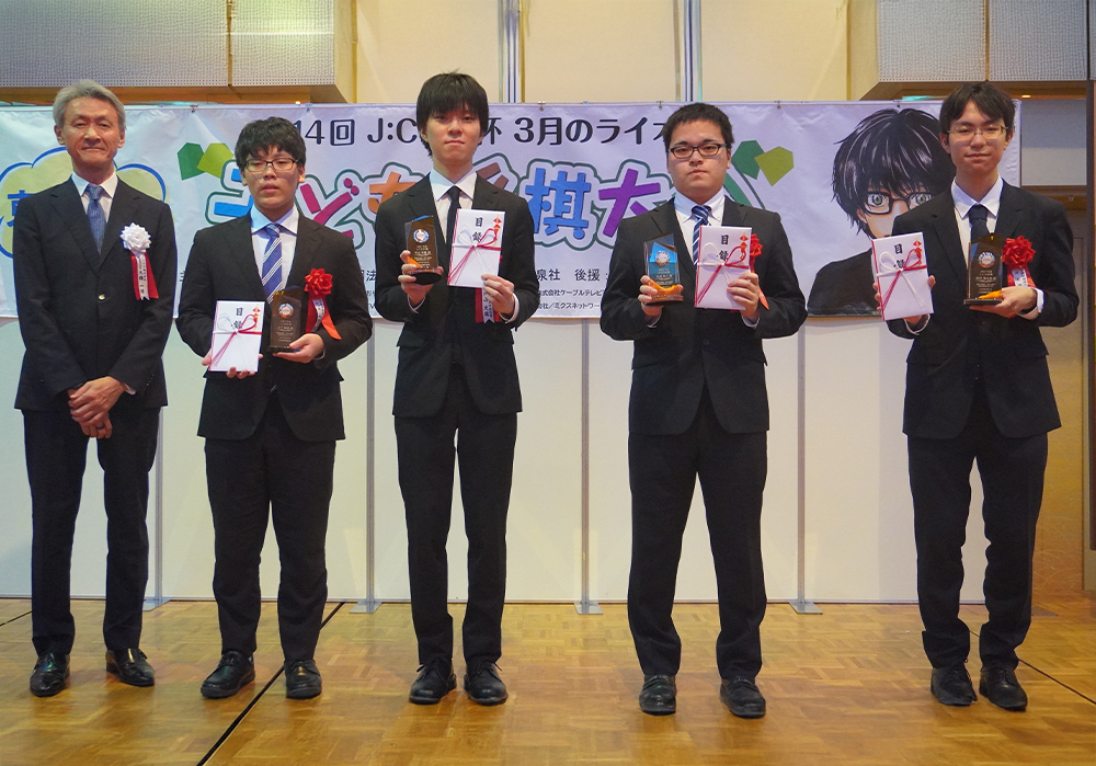 From left: J:COM Taguchi, Akihiro Ida 4th dan, Yuki Yokoyama 4th dan, Bungo Fukusaki 9th dan